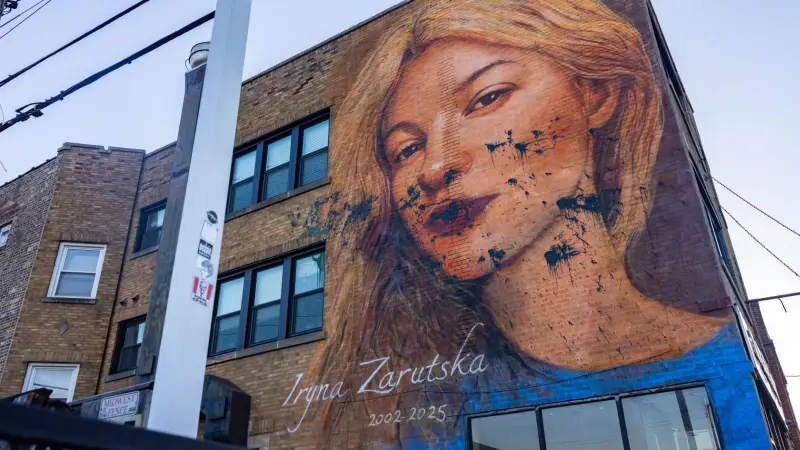 Ірина Заруцька, 23-річна українська біженка, зображена на муралі від плечей вгору, у синій сорочці та з м’яким поглядом на обличчі. Її ім’я написано білими літерами над датами 2002-2025. Заруцька була смертельно зарізана минулого літа, коли їхала поїздом додому з роботи в Шарлотті, Північна Кароліна.