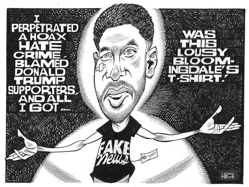 Ось чому це так важливо. Якби було багато расизму, не було б потреби вигадувати випадки расизму. Жоден єврей у Німеччині 1930-х років не вигадав антисемітської містифікації. Жоден єврейський власник магазину ніколи не звинувачував у тому, що нацист жбурнув камінь у його вітрину. Причина? Жодна не була потрібна. Ненависть нацистів до євреїв була реальною. Не треба було підробляти. Щоб переконати людей у тому, що Америка расистська, потрібно підробити це.