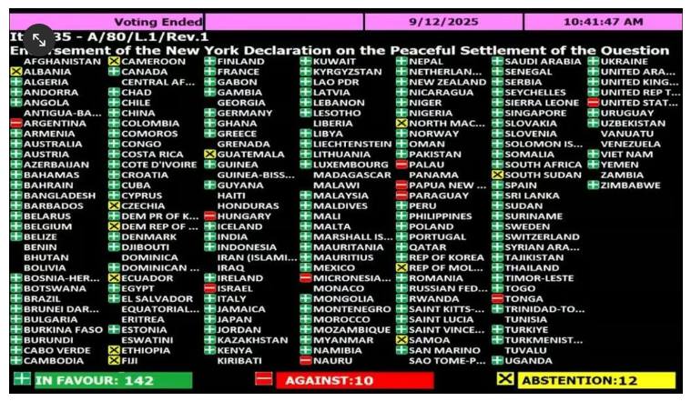 (Проти проголосували: Аргентина, Угорщина, Ізраїль, Мікронезія, Науру, Палау, Папуа-Нова Гвінея, Парагвай, Тонга, США. Утримались: Албанія, Камерун, Чехія, Конго, Еквадор, Ефіопія, Фіджі, Гватемала, Північна Македонія, Молдова, Самоа, Південний Судан.)