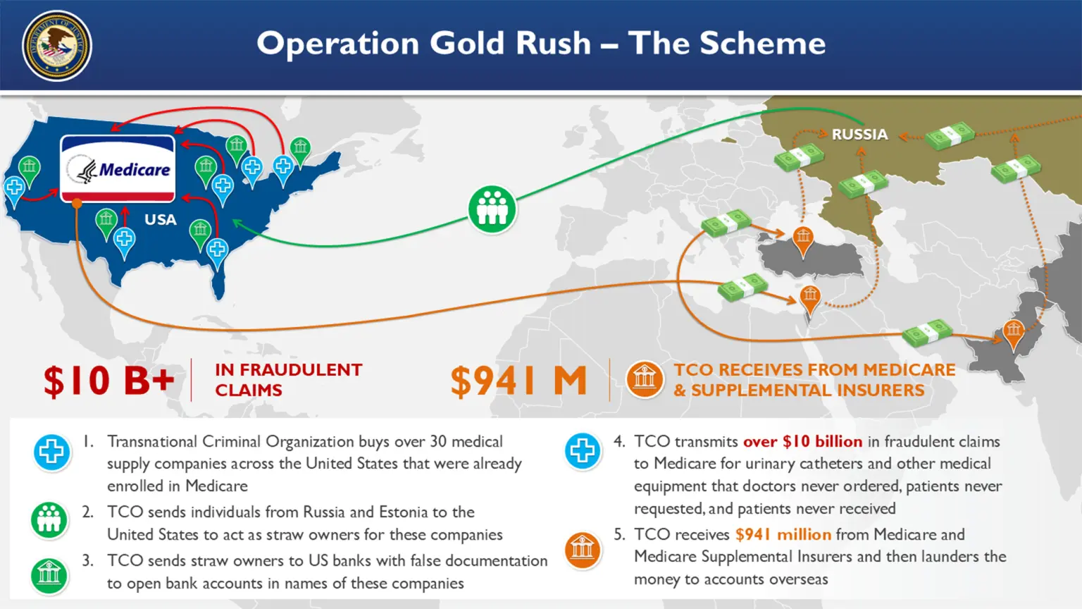 Це було частиною операції «Золота лихоманка», найбільшого такого роду шахрайства в історії, яка придушила злочинний синдикат з російськими банками, який ймовірно купував легальні компанії з постачання медичного обладнання для подання фальшивих заяв на довговічне медичне обладнання, крав особисті дані та обдирав Medicare.